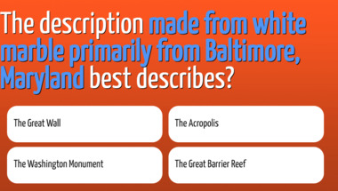 In this fun Geography quiz we're going to ask questions like "If you are in the city of Cork, where are you?" and "The description "made from white marble primarily from Baltimore, Maryland" best desc..".