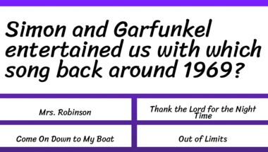 4/10 is the score to beat in this 1960s Songs quiz to put yourself over the average quiz taker. But you're probably going to be able to answer questions "Simon and Garfunkel entertained us with which song back around 1969?" and "Simon and Garfunkel entertained us with which song back around 1967?" easy!