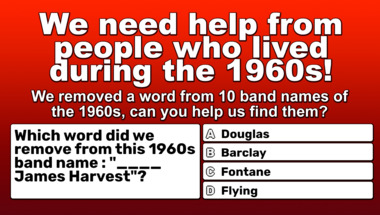 Look forward to questions like "Which word is missing from this 60s song title? : "Hello ____ Hello Fadduh"" and "Who sang this song : "Blue Velvet"?"